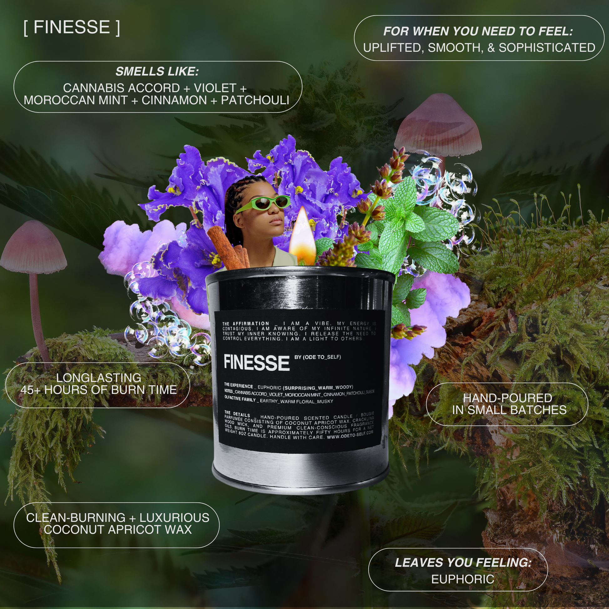 Introducing "Finesse," a candle that captivates with a euphoric blend of cannabis accord, violet, moroccan mint, cinnamon, and patchouli . This olfactory marvel unfolds as a mysterious symphony, where the enigmatic notes of cannabis accord and violet weave seamlessly with the invigorating essence of Moroccan mint and the warming allure of cinnamon. Patchouli adds a deep, grounding embrace, creating an ambiance that radiates euphoria and intrigue. Light "Finesse" to transform your space into a sanctuary of elation, where each note contributes to a fragrant tapestry, whispering stories of a life lived in the embrace of blissful mystery. Immerse yourself in the enigmatic allure of this fragrant embodiment.
